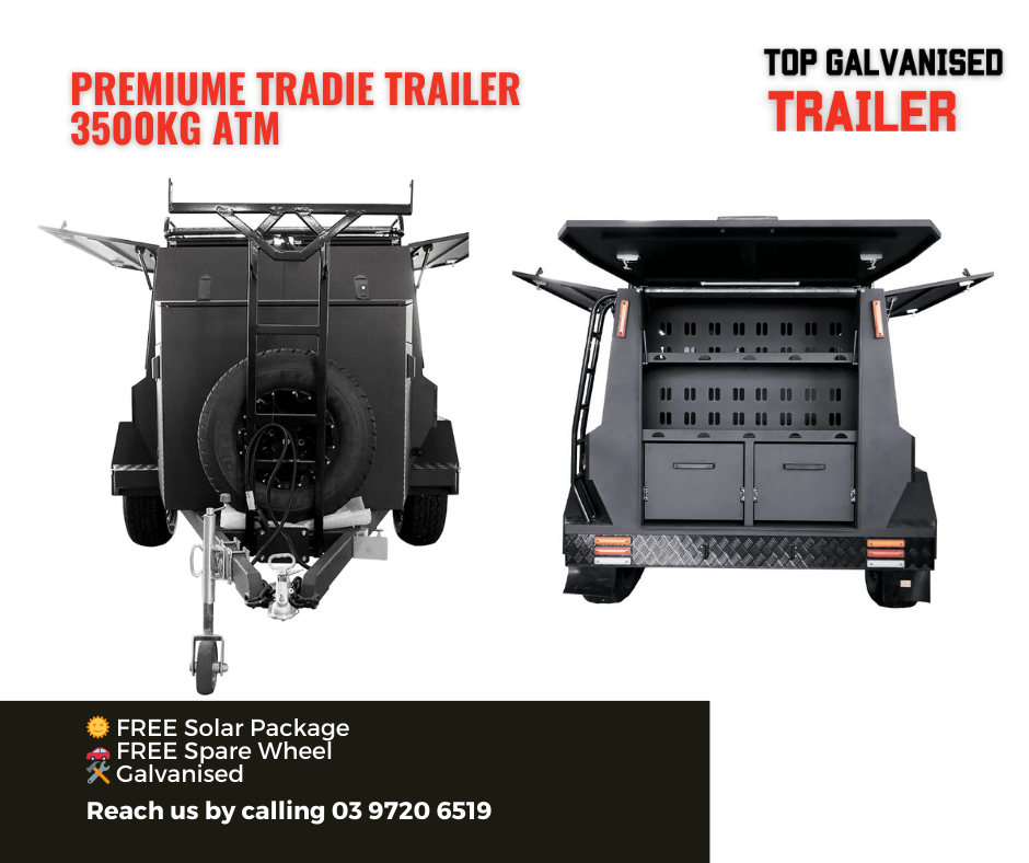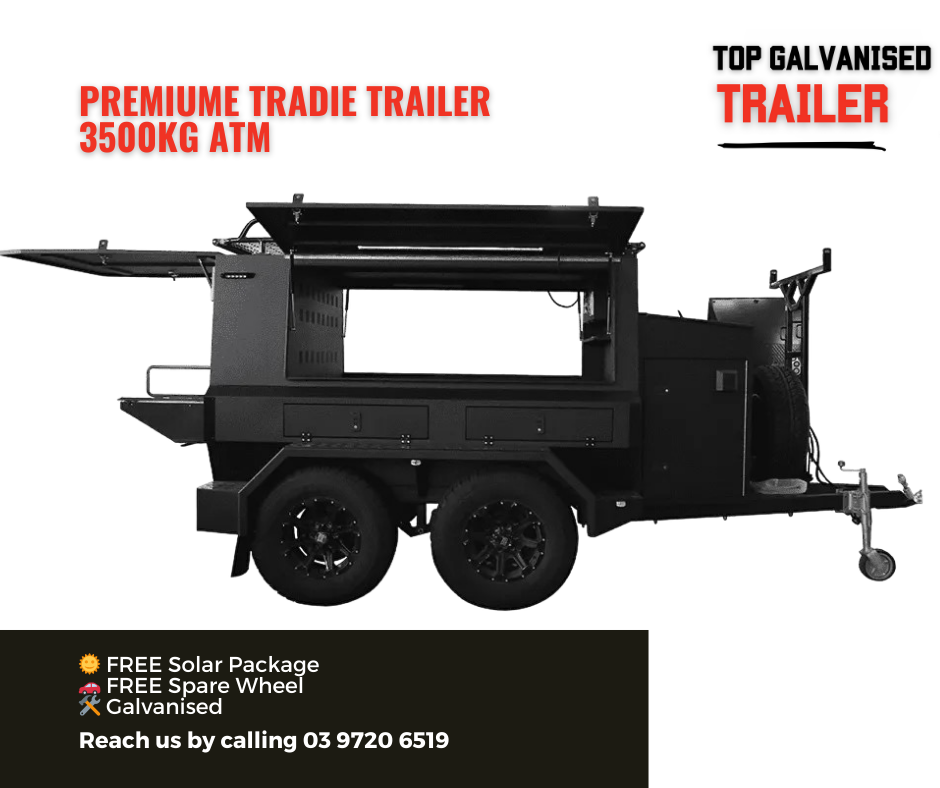 This Tradesman Trailer has a tare weight of 1590kg and ATM of 3500kg. It’s equipped with 256 75R16 inch tires and an 1800mm drawbar. Additionally, it includes dual batteries, Anderson plugs, external sockets, a water gauge, and a 70L water tank. Safety features comprise a black ladder rack with a spare tyre, solar panel slide-outs, compression press-release locks on all doors, and a rocker roller 9-leaf suspension.